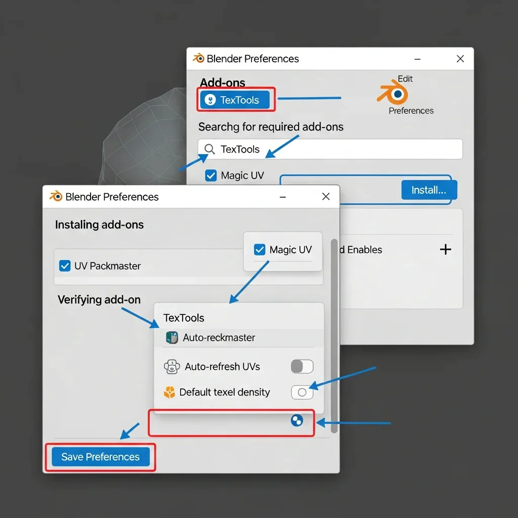 For an enhanced workflow, consider enabling optional add-ons. In the Preferences → Add-ons tab, use the search box to look for additional tools such as UV Packmaster (for automatic UV packing and density control) or Magic UV (for more complex UV tasks like alignment, scaling, and visual checks). Install and enable them just as you did with TexTools by pressing the Install button and enabling the checkboxes.