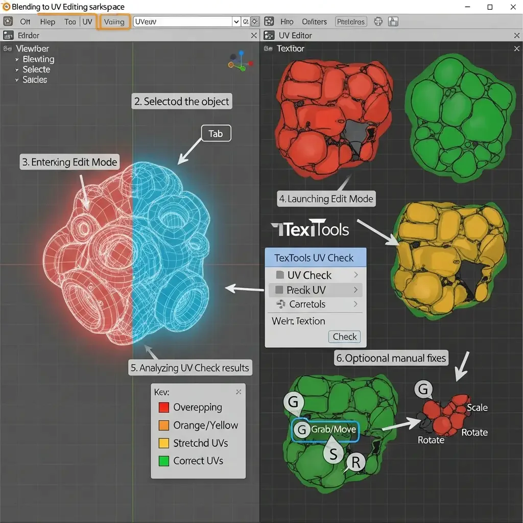 To start, switch to the UV Editing workspace by going to the top menu and selecting UV Editing. In this workspace, Blender is divided between the 3D Viewport on the left and the UV Editor on the right. Next, select the object you prepared in Step 1 by left-clicking on it in the 3D Viewport, making sure it is the active object. Then, enter Edit Mode by pressing Tab in the 3D Viewport, which changes from Object Mode to Edit Mode and makes all faces selectable. After that, launch TexTools UV Check from the top bar in the UV Editor by clicking on TexTools → UV Check, which will open a panel allowing you to detect overlapping and stretched UVs. Analyze the results by observing the highlighted UV islands: red indicates overlapping UVs, orange or yellow indicates stretched UVs, and green shows correct UVs. Highlight any potential problem areas that may need fixing. Finally, you can optionally perform manual fixes by selecting the problematic faces in the UV Editor and using G, S, or R to adjust the UV islands, ensuring that your UVs remain correct after applying auto texel density in Step 4.