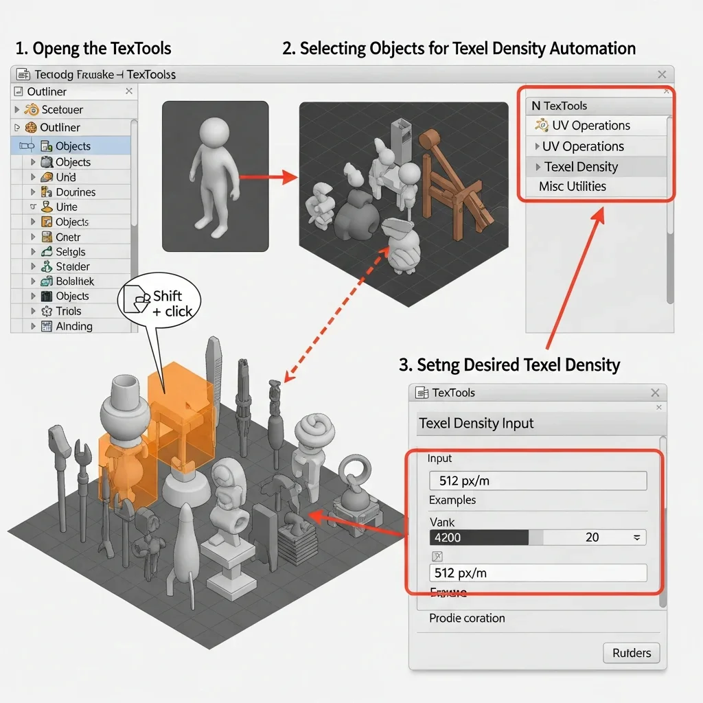 First, open the TexTools panel by going to the 3D Viewport, selecting the object(s) you want to work with, and opening the N Sidebar to click the TexTools tab. Pressing T will reveal the TexTools panel on the right side of your viewport, which is divided into several sections: UV Operations, Texel Density, and Misc Utilities. Next, select the objects for texel density automation by clicking on them with the left mouse button, or using Shift + LMB to select multiple objects. If you have more than one object in a folder or collection, expand the collection in the Outliner, then Shift + left-click all objects to select them in the 3D Viewport. After that, set the desired texel density in the TexTools panel under Texel Density by entering a value (for example, 512px/m) and clicking Apply, which automatically scales the UV islands to the target texel density, with a preview in Edit Mode showing whether the scaling is correct.