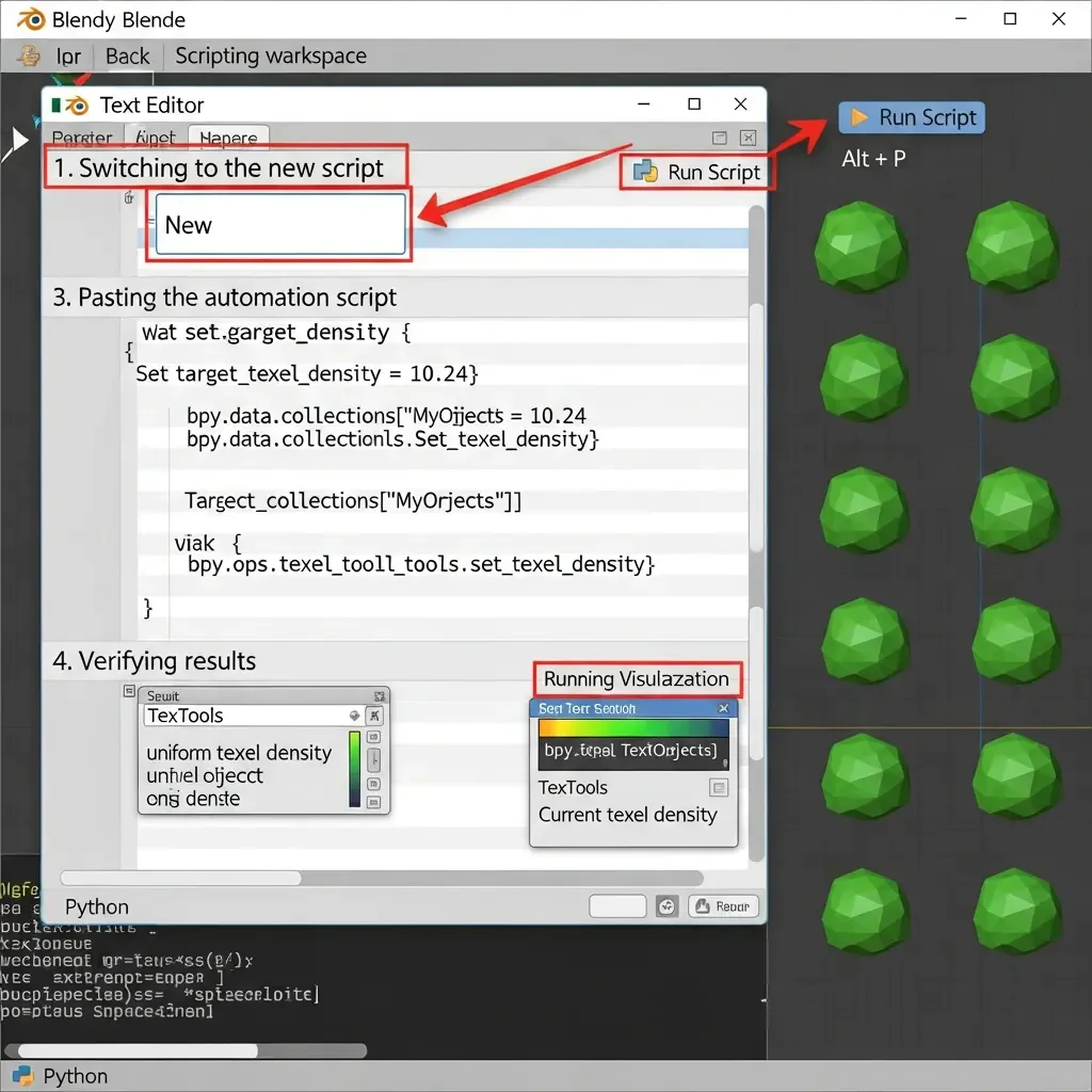 First, open a blank text file in the Text Editor and name it, for example, texel_density_automation.py. Make sure to replace “Your_Collection_Name” with the actual name of your collection. Then, run the script by going to the Text Editor and clicking the Run Script button at the top-right of the editor, or by pressing Alt + P. Blender will execute the script, automatically adjusting all objects in the collection, applying texel density uniformly, with visual feedback visible in the viewport if visualization lines are enabled. Next, verify the results by visually checking the objects in the 3D Viewport or using TexTools → Visualize Texel Density, ensuring that all UV islands are scaled appropriately, indicated by a green overlay for correct density. Finally, save the script for future use by going to Text Editor → File → Save As in your project folder, allowing you to reuse it in other projects and maintain a consistent workflow.