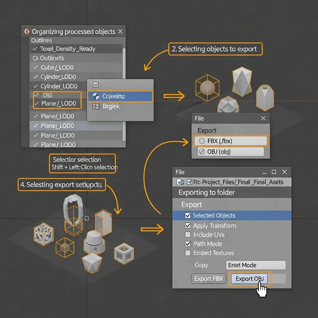 First, organize the processed objects by going to the Outliner, right-clicking, selecting New Collection, and naming it Texel_Density_Ready. Move all objects with confirmed UVs and applied texel density into this collection. Next, select the objects you want to export either by Shift + Left-Click on each in the 3D Viewport or by right-clicking the Texel_Density_Ready collection in the Outliner and choosing Select Objects, so all output objects are ready for export. Then, choose the export format by going to the top menu File → Export and selecting FBX or OBJ. For game engines like Unity or Unreal, use FBX; for render engines or generic pipelines, OBJ works fine. Configure the export settings in the export panel: enable Selected Objects Only, tick Apply Transform to preserve scale and rotation, tick Include UVs to ensure texel density is exported correctly, and enable Path Mode → Copy with Embed Textures if you want textures included. Export the objects to a folder within your “final assets” directory (e.g., Project_Files/Final_Assets) by clicking Export FBX/OBJ.