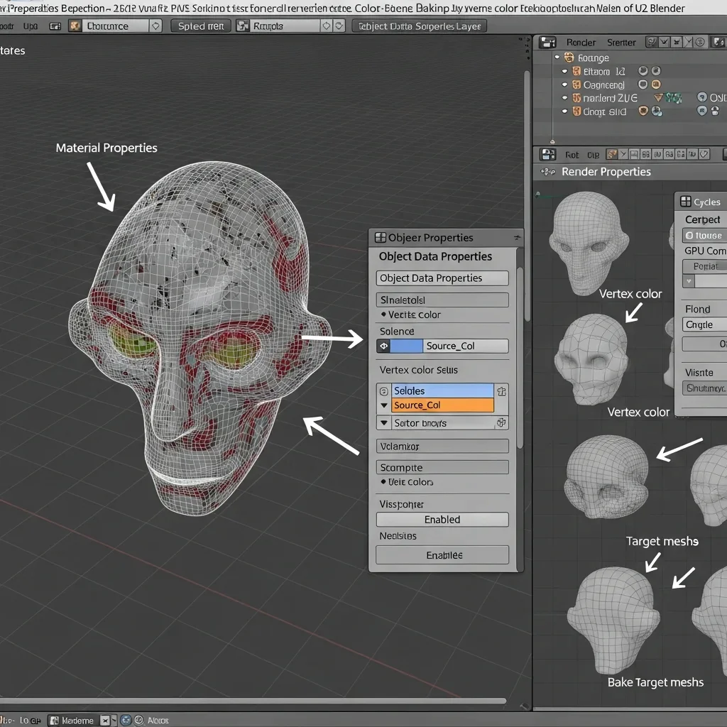 If you are using multiple source meshes, please make sure that each of them contains vertex color layer with the same name and all of them are set to be fully visible in the scene. For complex materials, be sure to select Cycles Render Engine (Render Properties → Render Engine → Cycles) because baking needs it. Optionally, if you have GPU, select GPU Compute on Device for accelerated processing.