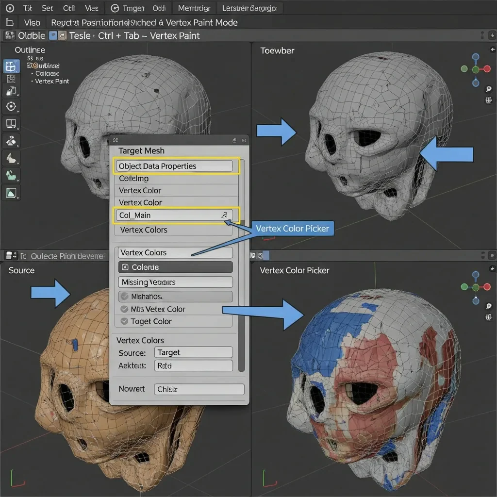 When the automatic baking is done, check each target mesh if vertex colors were successfully transferred. Choose a mesh in the Outliner, go to Vertex Paint Mode (Ctrl + Tab → Vertex Paint). Wherever you have missing areas, a repeat of colours that are too obviously not located in those places, or simple artifacts. Choose the Vertex Color Picker Tool from the toolbar if you would like to sample colours on mesh and compare them with the source. If you find that a mesh is lacking the Col_Main vertex color layer, you just need to add it by hand in Object Data Properties → Vertex Colors → + New exactly as called in the baking script (i.e. Col_Main).