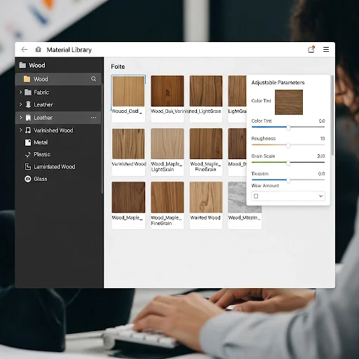 Start by dividing furniture materials into large, easy-to-understand groups—like wood, fabric, leather, metal, plastic, and glass. These major categories help create a strong foundation for your material library, allowing you to organize different surfaces more easily.