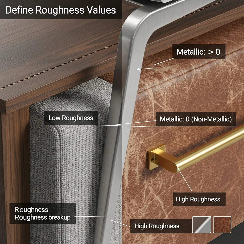 Roughness and metallic maps have a greater effect on how a material responds to light than any other PBR inputs. Wrong values result in unrealistic reflections or shading as well as noisy surfaces which cannot be treated later. Correct roughness and metallic values help make sure furniture materials are believable, stable and physically accurate in all your scenes lighting conditions.