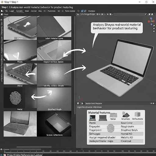 First, collect high-quality product images (front, side, and close-ups) of the item, such as a laptop, and store them in a dedicated folder (e.g., ProjectFolder/References/Laptop/). Examples of images could include References/Laptop/Laptop_Plastic_01.jpg, References/Laptop/Laptop_Metal_01.jpg, and References/Laptop/Laptop_Screen_01.jpg. Next, label each image by its corresponding material type, such as Laptop_Plastic, Laptop_Metal, or Laptop_Screen.