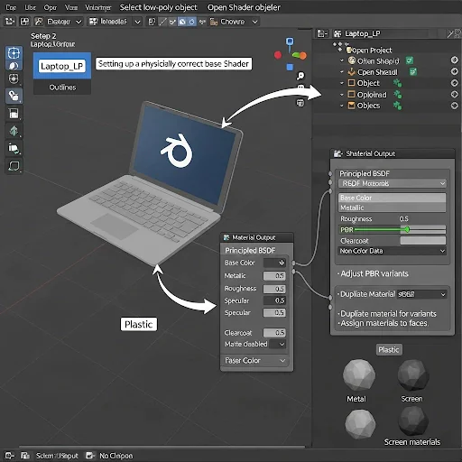First, open your Blender project by launching Blender and going to File → Open, then select the .blend file where the laptop object is located. To see all of the objects, switch to the Layout workspace from the top bar. In the Outliner (top-right), find your laptop low-poly object (e.g., Laptop_LP) and click on the object’s name to select it. You can press the Numpad to zoom in on the object in the 3D Viewport. Next, open the Shader Editor by switching one of the panels to it. Click on Editor Type in the top-left corner and choose Shader Editor. Ensure that your low-poly object is selected, and click its material slot to either view or create a material. If no material is assigned, click on New, assign the material, and name it Laptop_BaseMat. Ensure that the Principled BSDF node is connected, then set the Base Color to a neutral gray (0.8, 0.8, 0.8) to start. For the Metallic setting, set it to 0 for plastic parts and 1 for metal parts (like chainstay and screws). Set the Specular to 0.5 and Roughness to 0.3, adjusting further as needed to match the reference. Set Clearcoat to 0 for matte surfaces, or increase it for glossy/polished surfaces.