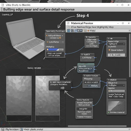 Add a MixRGB node (set to Multiply) and plug it into the Roughness input. After these adjustments, preview the shader in Material Preview mode by rotating the laptop model. Check for the correct edge highlights, proper reflection behavior on metal edges, and subtle variation on the plastic parts. Finally, adjust the ColorRamp sliders to control the intensity of edge wear and scale the Noise texture if needed to match the reference image. Once satisfied, save your shader by going to File → Save. The suggested file path for saving is ProjectFolder/Blender/Laptop_CustomShader_EdgeWear.blend.