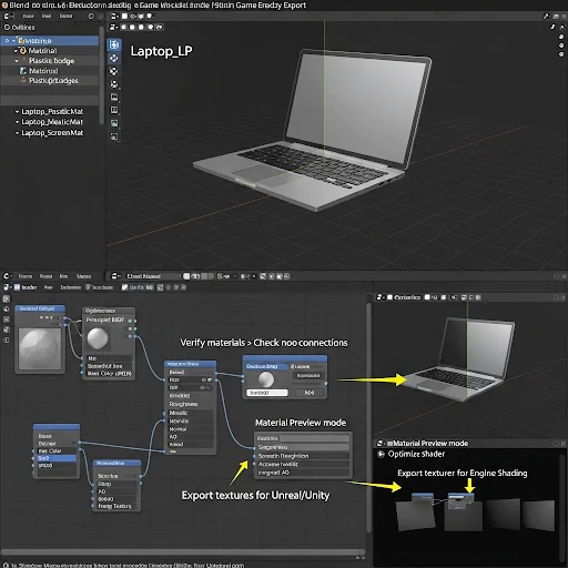 Start by finalizing the material assignments in Blender. Select your low-poly laptop object (e.g., Laptop_LP) from the Outliner, and check that all materials are correctly assigned: Laptop_PlasticMat for plastic parts, Laptop_MetalMat for metal parts, and Laptop_ScreenMat for the screen. Next, open the Shader Editor and confirm that all Principled BSDF nodes are correctly connected to the Material Output. Check that your baked textures and procedural nodes are connected as follows: Base Color to the Base Color input, Roughness to the Roughness input (set to Non-Color), Metallic to the Metallic input (set to Non-Color), and Normal to the Normal Map input.